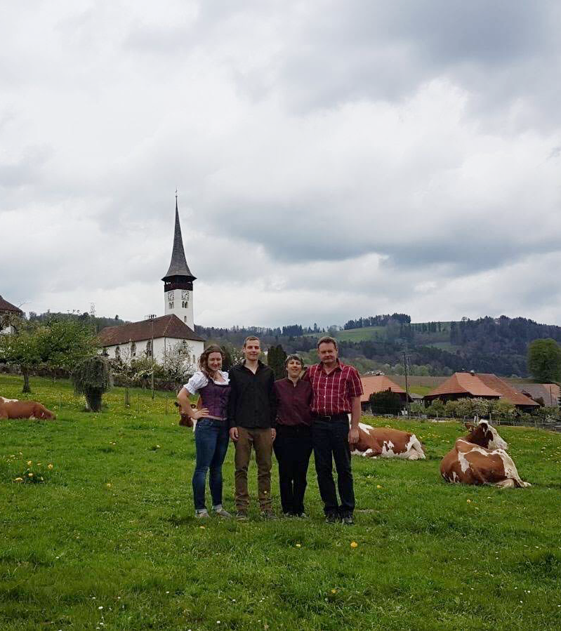 Wir bewirtschaften im bernerischen Gürbetal einen gemischten Betrieb mit Ackerbau und Milchwirtschaft. Auf den rund 23 Hektaren landwirtschaftlicher Nutzfläche bauen wir Natur- und Kunstwiesen, Weizen, Gerste, Triticale, Silomais, Weisskohl und Quinoa an.